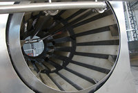 由電機帶動中間軸上的鏈輪旋轉從而帶動滾筒的旋轉,滾筒上有三個大法蘭,由六個托輪支撐,滾筒速度可由電機作調整。滾筒內壁裝有導料長條,滾筒內有噴淋水管,下方有兩個水箱,進料方噴淋管的水來自出料邊水箱,此水采用循環(huán)水;出料處的噴淋水來自進料邊的水箱,此水是清水。